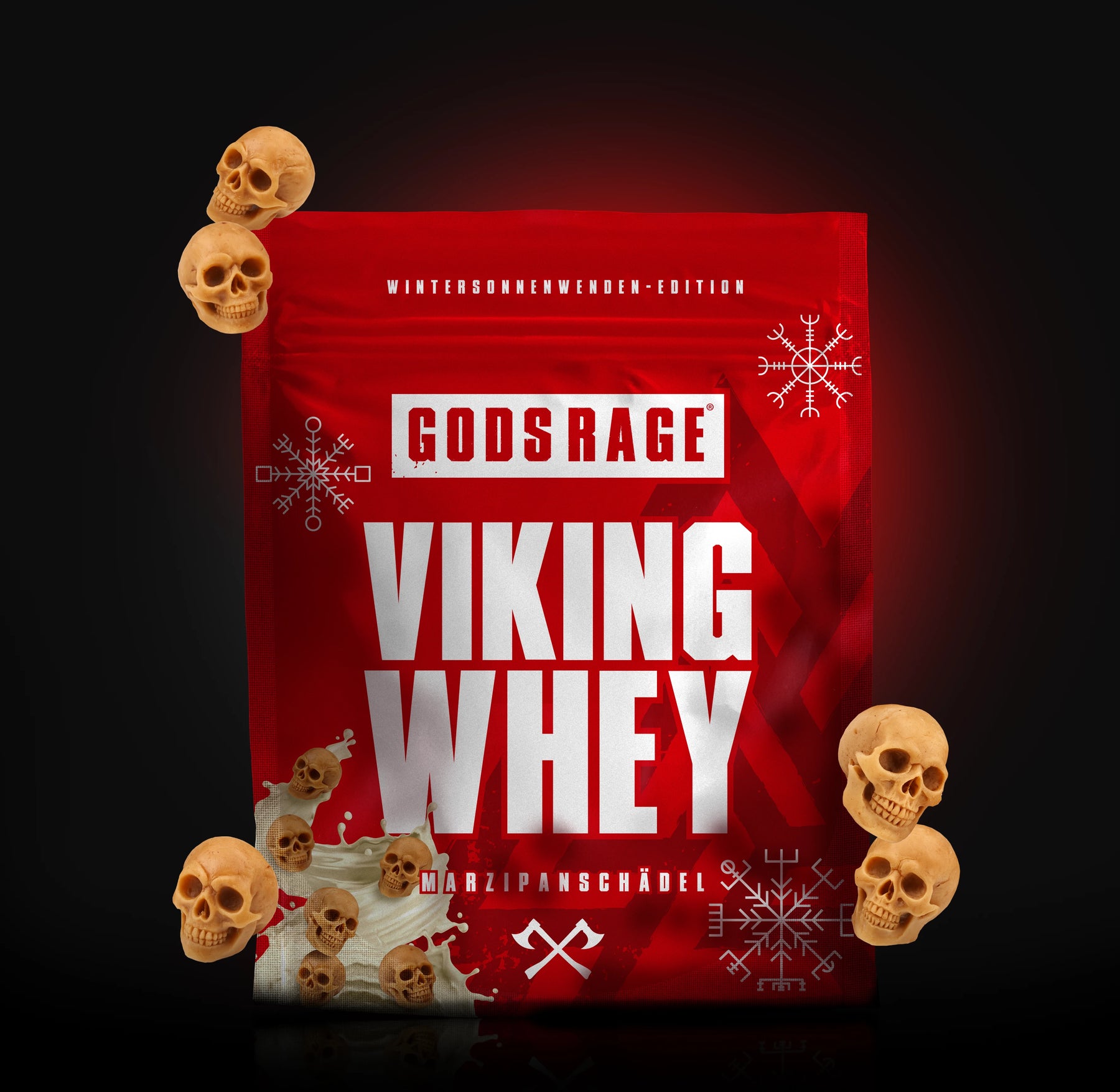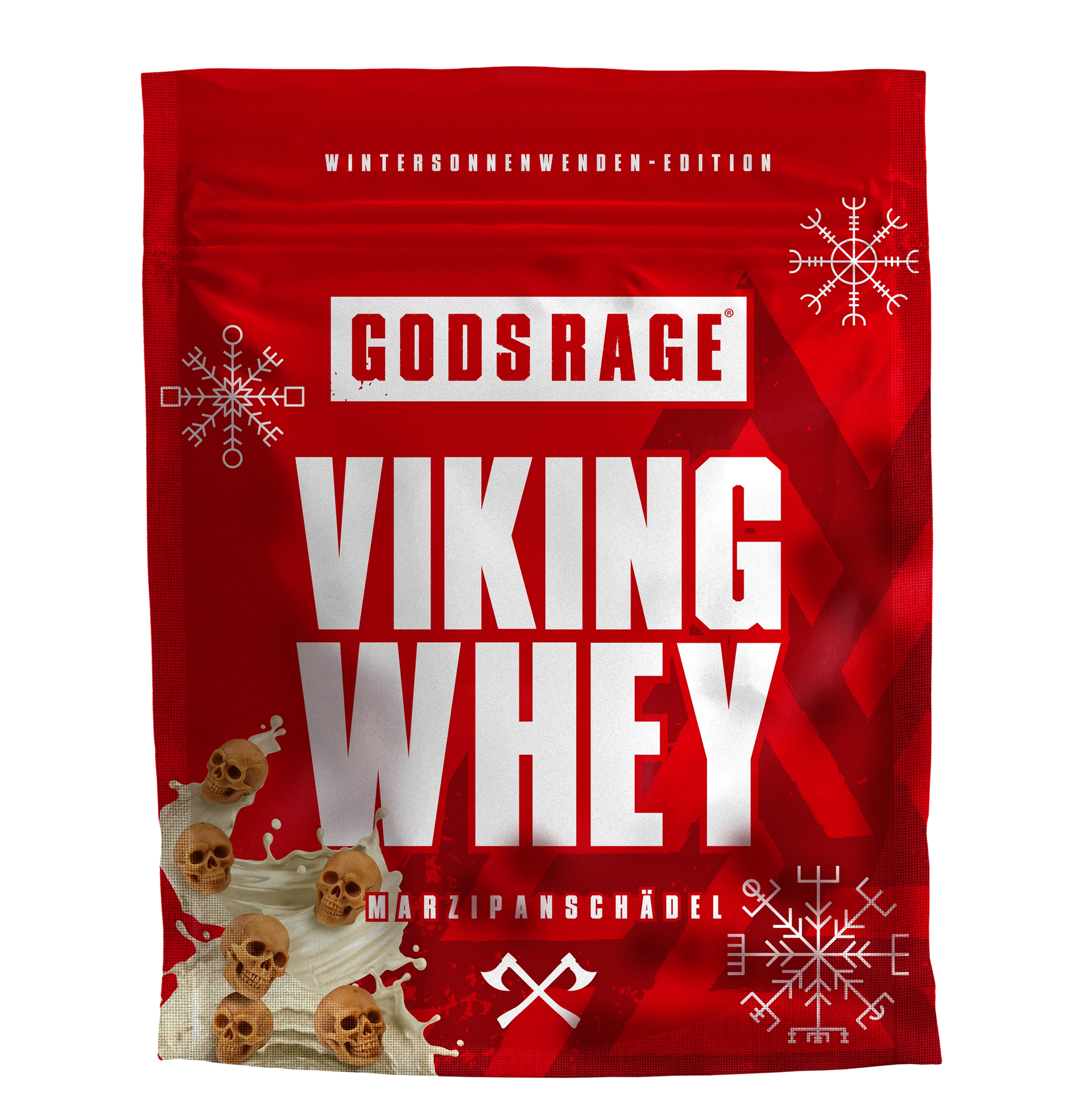 Wenn Schnee die Landschaft bedeckt und das Feuer in der Halle knistert, beginnt die Zeit der Stärke, der Rituale und der Vorbereitung auf kommende Schlachten. Viking Whey Marzipanschädel verbindet nordische Härte mit der süß-mandeligen Tiefe klassischer Marzipankartoffeln – eine winterliche Wohltat für Krieger, die auch in der dunklen Jahreszeit kompromisslos wachsen wollen. Der intensive Marzipan-Geschmack entfaltet sich weich und süß, aber nicht überladen. Optimale Nährwerte treffen winterlichen Genuss.